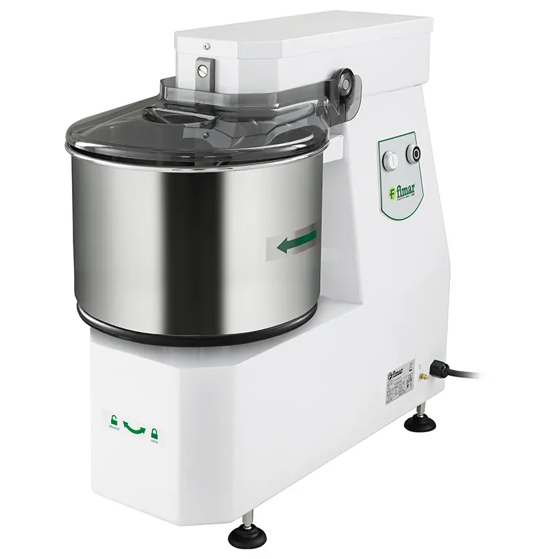 Impastatrice a spiane con testa sollevabile e vasca estraibile.