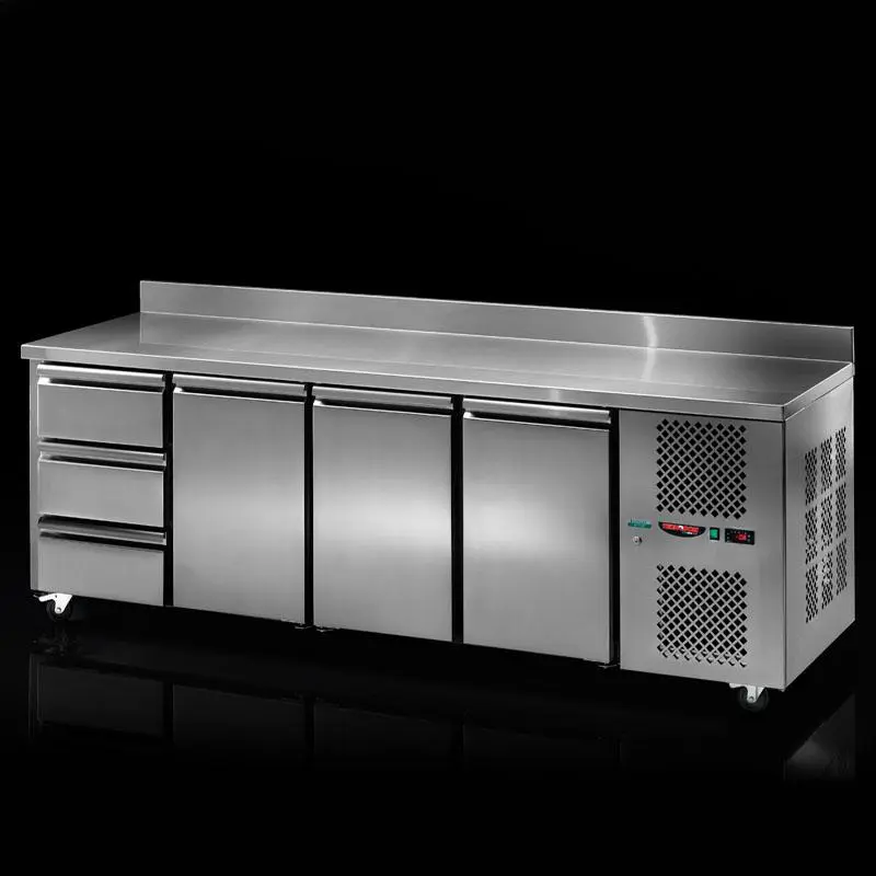 Tavolo refrigerato con motore incorporato, 3 sportelli e cassettiera.